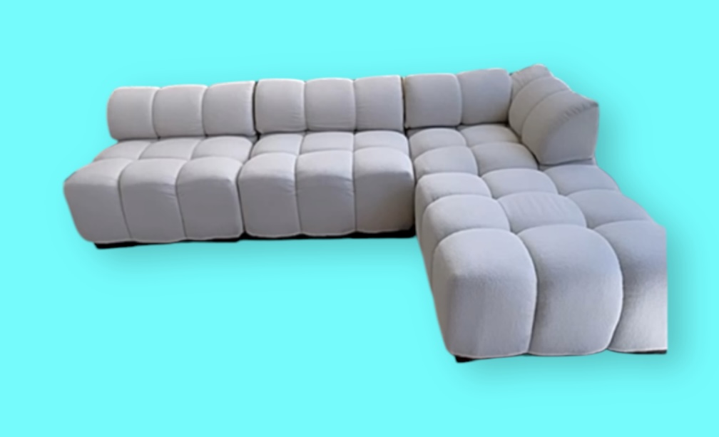 Sala modular tapizada en tela bouclé, versátil y multifuncional. Puedes organizar los 4 modulos de manera tal que puedes tener desde un conjunto de sillones individuales, hasta un gran sofá, e incluso improvisar una cama.